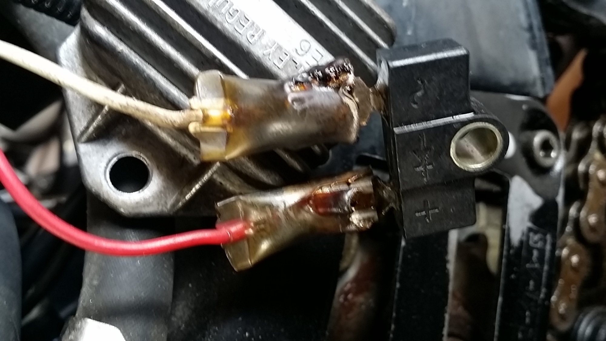 Salve, questa mattina dopo vari lavoretti di manutenzione sulla mia XT500 1U6 anno 1985, provando ad accenderla ha iniziato a fumare dal dietro della batteria....ho smontato tutto il vano batteria ed ho trovato i faston del raddrizzatore cotti... Vedete foto... Sapete cosa sarà successo? Grazie